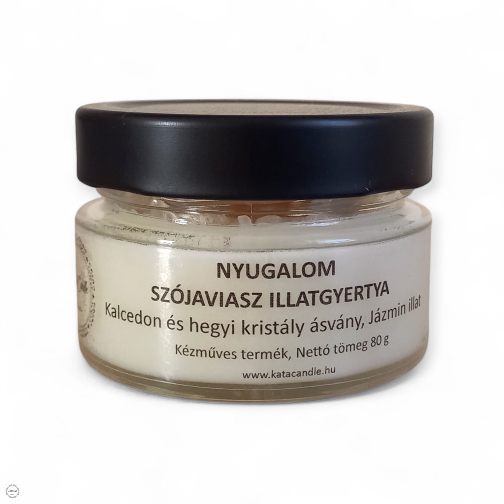 Jázmin illatú prémium gyertya kalcedon és hegyi kristály ásványokkal – a nyugalom és belső béke megtestesítője.