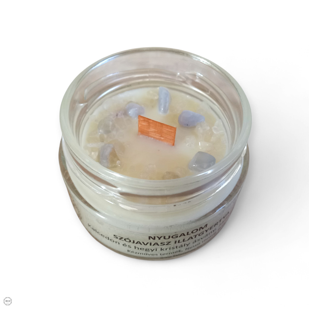 Jázmin illatú prémium gyertya kalcedon és hegyi kristály ásványokkal - a pihenés és az otthon melege.