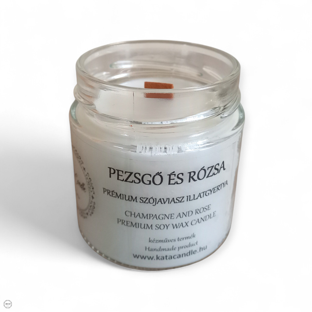 Pezsgő és rózsa illatú kézzel készült szójaviasz illatgyertya, fakanóccal, üvegtégelyben.