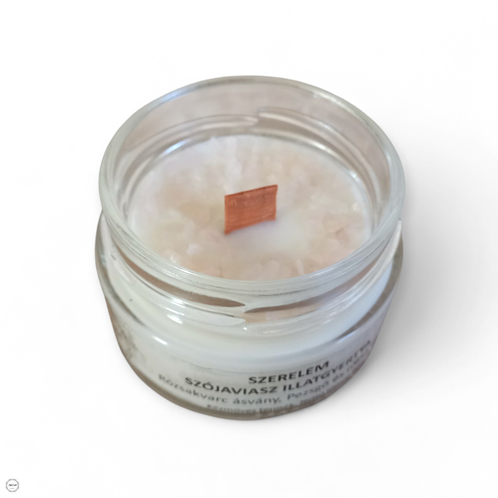 A gyertya így nem csak illatával, hanem az ásvány különleges jelentésével is a szeretet légkörét teremti meg — tökéletes választás romantikus hangulathoz, önmagad kényeztetéséhez vagy akár ajándékként, szívből szívnek.