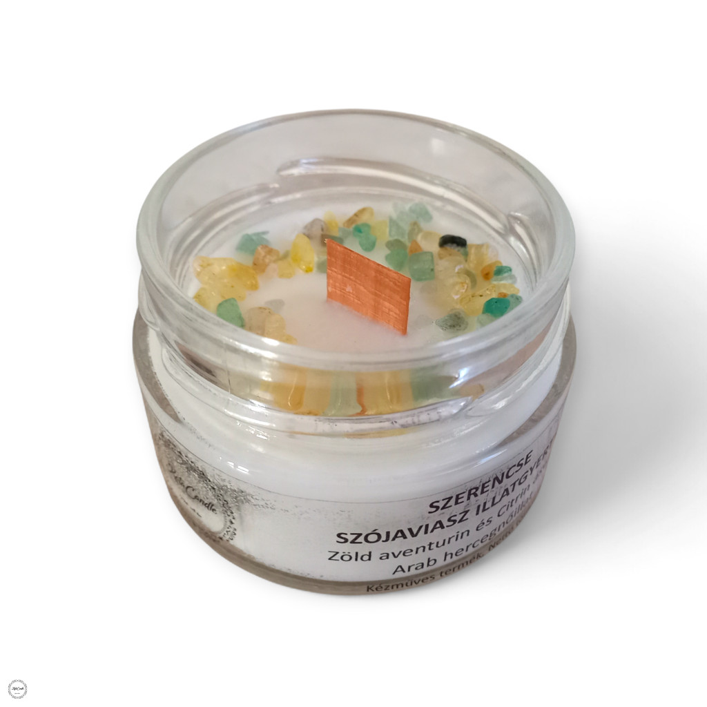 Zöld aventurin és citrin ásványokkal díszített gyertya.