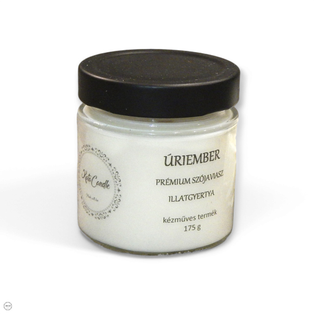 Úriember prémium szójaviasz illatgyertya, kézzel készült, fakanóccal, üvegtégelyben.